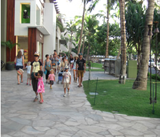 | ▲カラカウア通りを歩く一行 | ▲ワイキキビーチで砂遊び | ▲ドンキホーテ店内の垂れ幕 |