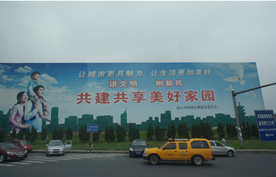 | ▲紹興への車窓から | ▲紹興市・精神文明建設委員会の巨大看板 |