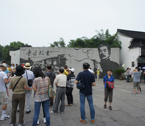 | ▲早速、記念集合写真。旗を持っているのが陳さん | ▲千灯の水郷風景 |