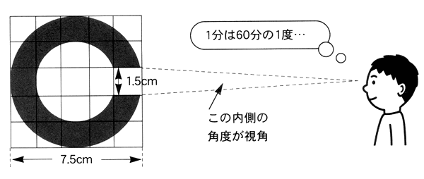 環を5mの距離から見たときの視角は1分です。5mの距離からこの大きさのランドルト環が見える視