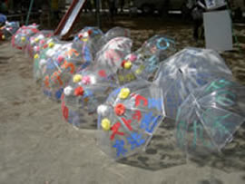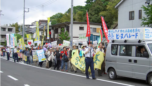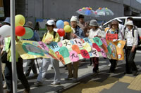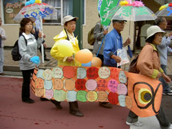 生田9条の会は、立ち上げの会で作ったオリジナルTシャツを着て参加、「9条を守ろう」「ストップ!憲法改悪」「9条は世界の宝」など色鮮やかに書きこみ花で飾っ透明ビニール傘を片手に持って歩きました。 |