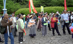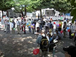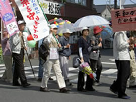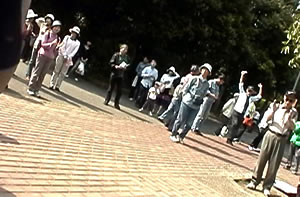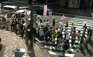 新婦人は、「平和大好き、戦争きらい。憲法9条を守ろう」の文字に、9条への思いを込めた寄せ書きをあしらった横断幕。集いの会場で、出発直前にも書き込んでいました。 向ヶ丘遊園南口駅前広場をグルリと1周。日曜の昼下がりとあって人出も多く、おのずとシュプレヒコールの声も大きくなります。駅利用者・待ち合わせの人・通行人などは、パレード隊を歓迎してくれているようにも見えます。ここは、「多摩平和アピール行動」の人たちが、毎月決まった日に平和のためのアピール行動を行っているところです。 |