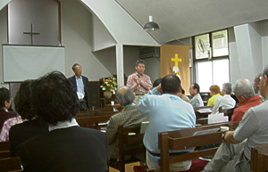 映画のあと1時間ほど、『生田9条の会』の呼びかけ人でもある禿牧師と生田9条の会からの訴えや、参加者による意見交換会がありました。