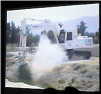 開発した除去機は、パワーショベル(土木重機)を改造したもので、作業が7m間隔ででき360°回転するので便利で効率がよく、運転席などが地雷の爆発に耐えられるよう特殊な鋼板で補強され、ショベル部分に突起をつけたドラムを回転させて地表を掘り起こし爆発処理する。一台で250〜300人分の仕事をこなし、3000万円くらいする。この機械の開発や審査の苦労話などもまじえながら訥々と話をすすめられました。見ていると機械のショベル部分が回転しながら地表を這うように掘削し、それに当たった地雷が爆発します。ここは池などの水場でしたが、人が通る所どこでも地雷を埋め、水を汲みに川へ行く、洗濯に行く、子どもが水遊びやボール遊びをする野原など、争いに関係なく無差別に子どもや女性が行くところに地雷を埋めるやり方はとても許せない、と語気を強めます。