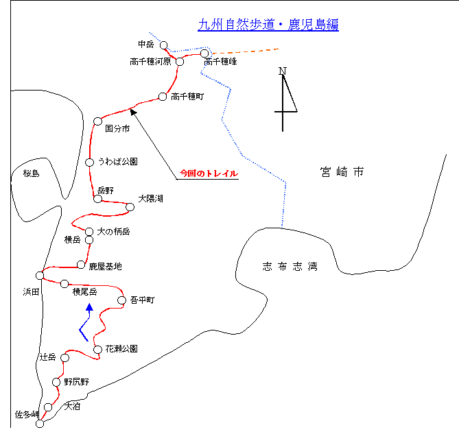 | 1日目(1月30日)宮崎港から油津駅:港発(21:30)-宮崎駅(21:45-22:15)-油津駅(23:39)。 2日目(1月31日)油津駅から佐多岬:駅発(6:14)-志布志駅(7:24-7:48)-鹿屋(8:50-9:00)-根占(9:56-10:58)-大泊(11:52-12:40)-佐多岬バス停(12.54:)-徒歩で佐多岬往復(12:55-13:20)- 徒歩で大泊キャンプ場(14:40)テント設営。 3日目(2月1日)大泊キャンプ場から野尻野:テント発(6:30)-間泊(8:10)-郡(10:10)-松山(11:00)-折山道間違(11:30-13:10)-菖栄(14:30)-野尻野(15:00)テント設営。 4日目(2月2日)野尻野から花瀬公園:テント発(6:10)-野首岳(8:10)-辻岳(9:40-9:50)-県道出合(10:45)-滑川(12:00-12:30)-花瀬公園(14:10) テント設営。 5日目(2月3日)花瀬公園から吾平町:テント発(6:10)-上原(7:00)-笹原峠(9:00)-池田(11:00-11:20)-真戸原(11:50)-金山(12:35)-吾平(13:40) テント設営-後吾平山上陵・往復(15:45-16:25) 6日目(2月4日)吾平から浜田・海水浴場:テント発(5:40)-大牟礼(7:40)-陣ノ岡登山口(9:30)-陣ノ岡(10:40)-横尾岳自然公園(11:40)-浜田(13:50)設営-後近くの坂元温泉行(16:00-17:30)。 7日目(2月5日)浜田から御岳登山口:テント発(5:40)-霧島ケ丘公園(6:30)-今坂町(7:30)-大浦(9:35)- 御岳登山口(11:00) テント設営。 8日目(2月6日)御岳登山口から堀切手前1Km:テント発(6:00)-御岳(9:10)-大の柄岳(11:00)-登山口(12:20)-堀切手前1Km (14:20) テント設営。 9日目(2月7日)堀切手前1Kmから輝北うわば公園:テント発(5:10)-堀切道間違(5:30-6:30)-大隈湖橋(8:00)-岳野(10:10)-牛根峠(11:25)-輝北うわば公園(12:30)テント設営。 10日目(2月8日)輝北うわば公園から国分市石橋中学校:テント発(6:20)-狐け丘(7:20)-旭ケ(8:30)-国道10号交差点(10:30)-亀割峠(12:00)-石橋(13:30)テント設営。 11日目(2月9日)石橋から高千穂小学校側:テント発(5:15)-清水・つるた温泉入浴(7:00-7:40)-道場口(8:20)-霧島神宮駅口(10:40)-田口(11:30-12:30)- 高千穂小学校側(13:35)テント設営。 12日目(2月10日)高千穂小学校側から宮崎県・御池キャンプ場:テント発(5:00)-大鳥(5:30)-高千穂河原ビジターセンター(7:50)-中岳往復(8:00-9:25)-高千穂峰(11:20)-霧島東神社(13:20)-御池キャンプ場(13:40)テント設営。 13日目(2月11日)御池キャンプ場から椎屋:テント発(7:00)-皇子温泉(7:35)-狭野神社(7:45)-高原駅(8:35)-霞神社(10:35)-椎屋大橋手前(12:10)-椎屋集会場(13:10)テント設営。 14日目(2月12日)椎屋から照葉大吊橋先4km:テント発(5:50)-岩瀬ダム(7:00)-大尾(10:00)-広沢(11:05)-照葉大吊橋(13:30)-橋先4km(14:40)テント設営。 15日目(2月13日)照葉大吊橋先4kmから清水兼:テント発(6:25)-尾立(7:10)-杢道(7:50-8:10)-法華嶽(9:10)-八重尾(10:00)-籾木池(11:05-11:15)-囲(12:20)-清水兼(14:40)テント設営。 16日目(2月14日)清水兼から西都原:竹ト発(5:45)-九流(6:10)-長谷川観音分岐(7:20)-上山(8:15)-西都原古墳(9:10-9:40)-西都原・石貫付近(10:45) テント設営。 17日目(2月15日)西都原から旭ケ丘:テント発(5:10)-杉安橋(6:15)-竹尾(7:05)-川原橋(8:20)-白木八重(9:00)-長草(10:00)-青鹿池(12:10)-旭ケ丘(13:00)テント設営。 18日目(2月16日)旭ケ丘から矢研キャンプ場:テント発(5:20)-(6:25)-細(7:20)-矢研キャンプ場(8:50)テント設営。 19日目(2月17日)矢研キャンプ場から牧水公園経由日向港:テント発(4:50)-石並川(8:40)-神陰(10:35-10:45)-牧水公園(12:00-14:05)-日向駅(14:50)-日向港(19:00)-川崎港着・翌日17:30。 |