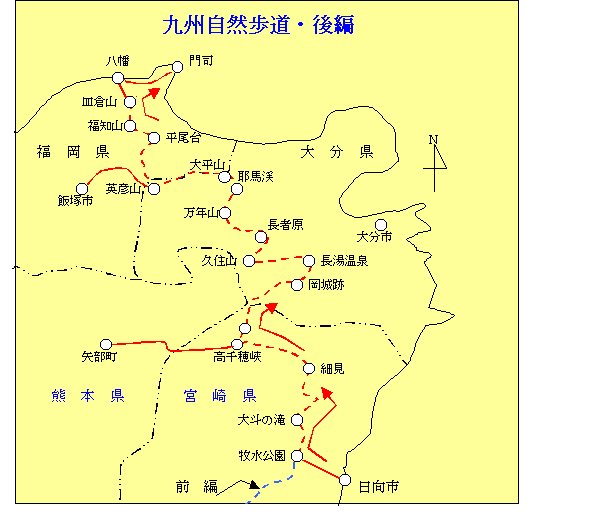 | 1日目(4月23日)宮崎港から牧水公園:港発(16:50)-日向駅(17:00-17:24)- 牧水公園(18:15) 牧水記念館・テント設営。 1)日向駅前の都町バス停から神内行き(最終便は18:34)に乗り40分程で牧水公園に着く。大手スーパーがバス停の近くにある。 2)牧水公園は坪谷川の対岸にありキャンプ場もある。 2日目(4月24日)牧水公園から田代・塚原発電所:テント発(5:00)-珍神山(8:20)-尾沢(11:10)- 横八(11:45)-峰(14:50)- 塚原発電所(14:30)テント設営。 1)珍神山を越えて新設林道を進むが、この道は稜線沿いに西方へ登り気味になる。トレイルは途中から右手に下る古い林道で分岐点に標識はない。 2)大斗の滝へは、坊の平キャンプ場まで滝の標示板はあるが、その先で2本の林道が交差していずれも無標識。 3日目(4月25日) 塚原発電所から宇納間・西野々農公園:テント発(5:10)-立石(6:35)- 造次郎山(10:20)-坂元(11:00)-西野々農公園(11:40)テント設営。 1)塚原発電所は耳川沿いの県道327号線脇にあり、水は近くの町営環境センターから入手した。 2)宇納間にはAコープがあり生鮮物や肉類も購入出来る。西野々農公園内には、屋根付きのテントスペースがあり快適なキャンプ地になった。 4日目(4月26日) 西野々農公園から山口原:テント発(4:30)-入下秋元(6:45)-小黒木(8:10)- 清水峠(10:50)-高畑(12:00)-山口原(12:40)テント設営。 1)清水峠の3km手前で舗装道に出て峠・ETOランドへ行き、復路は同じ道を引き返したので、合流点に荷物を置いて空身で行った方が賢明。 5日目(4月27日) 山口原から屋形原:テント発(4:50)-細見(7:10)-津船(8:15)-黒仁田(9:20)- 尾形原(11:00)先2kmテント設営。 1) トレイル上は、小さな食料店が黒仁田集落にあるだけ。 6日目(4月28日) 屋形原から丹助キャンプ場:テント発(4:30)-大中尾(5:43)-八幡森(10:15)- 丹助キャンプ場(12:20) テント設営。 1)上中尾集落(近くを通過)から八幡森間・約7kmは人家もなく、数本の林道が交差しているので視界が悪い日は間違い易い。水場もないように思えた。 2)八幡森から綱の瀬川に沿って3km程下ると登山口への標識あり。5kmほど丹助山の南麓の山道を巻きながら登ると林道になり八合目がキャンプ場になっている。 7日目(4月29日) 丹助キャンプ場から高千穂町:テント発(4:40)-日之影駅(6:40)-平底(8:10)- 上野峠(9:50)-野方野(10:40)-高千穂駅(12:00) YH大和屋泊。 1)日之影駅付近は集落の生活路が幾本もある。最短路と廻り道の差はあるがいずれも駅へ行く。出来るだけ早めの集落で駅への道を尋ねたい。 2) 一の水集落先から上野峠越えの登り口に標識がないので確認ないと解らない。 8日目(4月30日) 高千穂町から墓参:発(7:00)-墓参(9:30-12:40)- YH大和屋(14:00)。 9日目(5月1日) 高千穂町から五ケ所・本村:宿発(4:30)-折原(5:30)-平底(6:30)- 竜泉寺(7:00)-四季見台(9:30)-黒原越(11:00)- 本村(12:10)テント設営。 1)小阪越経由はトレイルが幾度も細かく蛇行して生活路と交差しているので、早朝で道を尋ねる人がいないためほぼ並行している県道を歩いた。 10日目(5月2日) 五ケ所・本村から神原矢作バス停:テント発(4:40)-登山口(6:40)-千間平(7:40)- 国観峠(8:10-9:10祖母山往復)-五合目(10:15)-神原(11:20)- 矢作バス停(12:20)テント設営。 1)祖母山登山口の駐車場に水場あり山頂まで標高差650m。大分県側・駐車場からは山頂まで標高差1000mあり。 11日目(5月3日) 神原矢作バス停から朝地町・サヤノ木:テント発(4:30)-中島公園(6:35)- 上片ケ瀬(7:30)-芝原発電所(8:20)-早尾原(9:00-9:30)- )-善光寺(9:20)-朝地(10:20)- サヤノ木(11:35)-2km先(12:10)テント設営。 1)入田集落から小高野、片瀬間は新道が交差しているので民家でトレイルを確認した。 2)河宇田の中島公園と普光寺先の用作公園は、テント地として適地。 12日目(5月4日) 朝地町・サヤノ木から納池公園:テント発(4:40)-鳥屋(5:40)-温見(6:15)- 長湯温泉(8:50-9:50)-筒井(10:30)-柚木(11:05)- 納池公園(12:40)テント設営。 1)朝地駅前のスーパーストアで食料購入、この先長湯温泉まで店なし。 2)サヤノ木集落から舗装の尾根道になるので炊事用の水はこの集落で入手した。 13日目(5月5日) 納池公園から法華寺温泉・大船山登頂:テント発(3:10)-牧場(4:40-5:55)- 表山道登山口(6:35)-佐渡窪(7:45)- 法華寺温泉(8:30)- 大船山登頂(10:30)- 法華寺温泉(12:30)テント設営。 1)佐渡窪までは表登山道の展望台より牧場の上部脇を通るトレイルになっている。 2)法華寺温泉から西面の中岳登頂は急斜面で一般路ではないようだ。 14日目(5月6日) 法華寺温泉から地蔵原・ファミリーキャンプ場:テント発(4:20)- 長者原ビジターセンター(6:20-6:30)-筋湯(8:50)-湯坪(9:40)-地蔵原(10:20)テント設営。 1)湯坪集落に小さな食料店あり、ラーメン、菓子類を購入した。 15日目(5月7日) 地蔵原から平原・三島公園:テント発(4:20)-日平峠付近(6:10)- 串野(6:30-6:40)-宝泉寺(7:00)-黒猪鹿(8:20)-万年山(10:00)- 豊後森駅(12:10-12:25)- 三島公園(13:30)テント設営。 1)天ケ谷貯水池の上部林道から東へ進み、日平峠付近から北面へ下るが町田牧場脇を通らず尾根一つ外れた林道を歩き串野温泉経由で宝泉寺温泉で合流した。 16日目(5月8日) 平原・三島公園から馬場・御祖神社