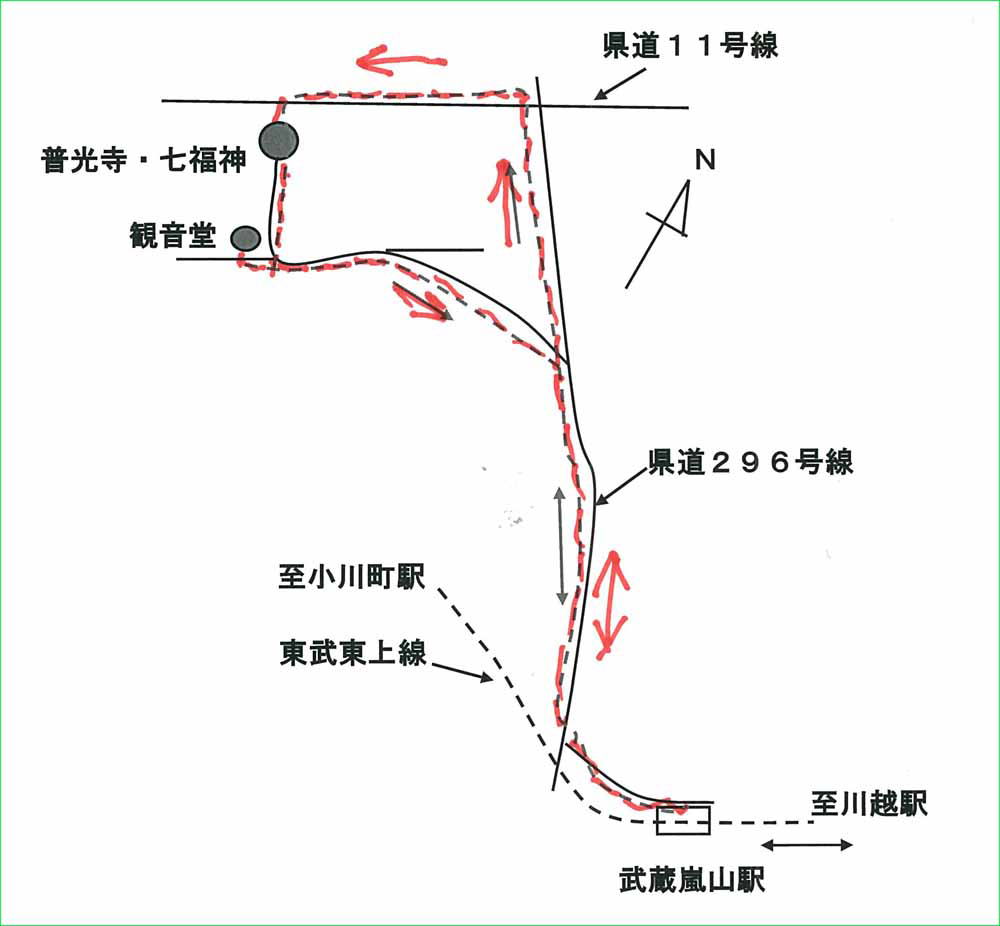 | 期 間:令和7年1月29日 (日帰り) 参加人員:2名 記:飯星宏徳 ![]() 普光寺 福禄寿 1 はじめに 今年最初の七福神巡りは、小川町・普光寺の境内と観音堂に祀られている。普光寺は天台宗・比叡山の末寺で、地元では「中爪の太師様」として親しまれているとのこと。 アプローチとしては武蔵嵐山駅を起点に約5km北方へ県道296号線と11号線を進む。 2 トピック&スケッチ 1月29日(水):武蔵嵐山駅から普光寺往復 武蔵嵐山駅から線路沿いに10分ほどで県道296号線に出る。交通量の多い県道を4kmほど北上して県道11号線の交差点へ。同交差点を左折して15分ほどで普光寺裏口に到着。各福神を参拝して500mほど南下して観音堂の2福神を参拝。帰路は296号線を経て武蔵嵐山駅へ戻った。 ![]() 七福神は、庶民の守護神として普段服で参拝出来る身近な文化と云える。混乱期の現代だからこそ必要と思える。 健康の ためだけでなく 自活して 暮らし営む 歩行願わん 3 あとがき 1)ロウバイの香りが、春の到来を知らせ<梅の開花も近い!>そんな誘いに春の日射しを期待して小川町の七福神を訪れた。しかし、午前中は春の装いであったが午後から冬並みの冷風に煽られた。 2)最近、ハイキング・ツアーに<ガストロノミー・ウオーク>が催されているとか。趣旨は里山のウオーキング+ランチ付でランチの料理がユニーク(郷土料理等)で食事文化を加味したウオーキングで女性や中高年に人気とか。シニア・ウオークとして地図を眺めて検討してみたい。 ![]() 大黒天 恵比須 弁財天 4 資 料 関 連 4-1概略タイム&概略距離(実働 4時間30分・距離:18km)自宅発着 1月29日(水):武蔵嵐山駅から普光寺往復 岩槻駅(8:25)・・・大宮駅(8:38/9:11)・・・川越駅(9:35/45)・・・武蔵嵐山駅(10:20)-県道11号線(11:46)-普光寺(12:00/25)-観音堂(12:34/45)―武蔵嵐山駅(14:06/13) ・・・川越駅(14:50/15:05)・・・大宮駅(15:30) 1)県道296号線は、交通量多く歩道は狭い(市野川左岸沿いの町道が適正。) 2)県道11号線交差点を左折して普光寺の裏側から入る(寺までトイレ無)。 3)別コース:小川町駅から「小川町パークヒル行」のバスで「5丁目バス停」下車、普光寺まで北方1km。バス時刻10:12・11:05川越観光自動車運行。 4-2 資料 国土地理院:武蔵小川地図(1/25000) ![]() 毘沙門天 寿老尊 布袋尊 概 略 図 ![]() ![]() |