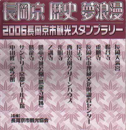 久しぶりに新田氏と京都をあるくことになった。伏見稲荷は今月は一日に私ひとりで詣ってきたので、どこへいくかは決めずに阪急電車に乗り込んだ。協議の結果西山方面に決定。長岡天神駅でおりたところ、駅前観光案内所に左のようにスタンプラリーをやっていた。気の向くままの旅なので今回はこれにのっかることにした。ここに書かれている場所のうち7ケ所まわると確認印をもらえて、商品の抽選に参加できるというのでとりあえず7ケ所を目標に出発。日曜日ではあるが、京中心からはなれているせいで、観光客はそれぞれの場所でほとんどみかけず、男ふたりほんとうにのんびりあるくことができた。今回はどこをどうみるというより先月同様のんびり歩くことに意義をかんじた。訪れたところはいずれも大型観光名所ではないのでいずれも地味ではあったが、がっかりすることはなかった。特に光明寺は青々としたもみじのトンネルが長く続きさぞかし秋は美しいであろうと想像された。西山公園グリーンハウスは中で自由に本が読め外では子供が水遊びしたり芝生のうえで弁当をひろげることができるなど小さい子供をお持ちの御家族は是非一度いってみることをおすすめします。
