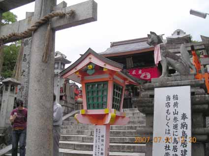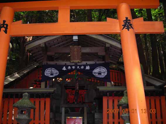 伏見稲荷大社本殿から30分ひたすら石階段を2000段以上登り詰めたところでやっとめざす一の峰上社に到着である。ここは末広大神を中心にお祀りして、そのまわりに数多くの神々が鎮座されており参拝者はそれぞれの家が信奉している神様にお参りすることになる。もともとこの一の峰上の社と二の峰中の社さらに三の峰下の社が本来の神の降臨された場所で伏見稲荷の本体であるらしい。のちに大勢の人がお参りしやすいように下に本社をかまえたとのことである。