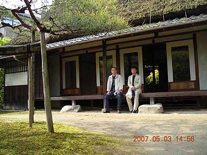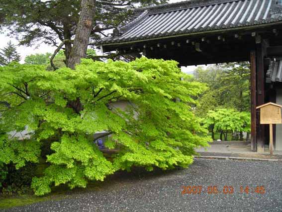 二度目の実相院(最初の写真)は5月の新緑の季節。門をはいったばかりのところに写真のもみじがみずみずしい緑をみせてくれる。常緑の松の木の根元にみごとに紅葉(こうよう)するであろうもみじを配置したのはすばらしい秋の季節を想像させるに十分である。この実相院を拝観中いきなりの雷鳴とともににわか雨がおちてきてここにすこしばかり足留めをくらったが、歩いている最中でなかったことが、幸運であったし名園の軒先きでの雨宿りはそうそうできるものではない良い経験であった。