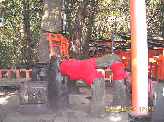 伏見稲荷奥社からお山するための道に少しはいったところに松の御神木が祭られている。この木自体はすでに枯れてしまっているが、写真のように奇妙な形に地上からでた幹が今はコンクリートでこのように補強(というかもうほとんどコンクリート)されていまも以前の姿をなくさないようにたもたれている。この幹をトンネルのようにしてくぐりぬけると足腰がいつまでも達者でおれるらしい。先月であったおばさん3人組は3回まわらねばならないといってらしたが、どうおまいりするかきまったことがあるかはしらない。