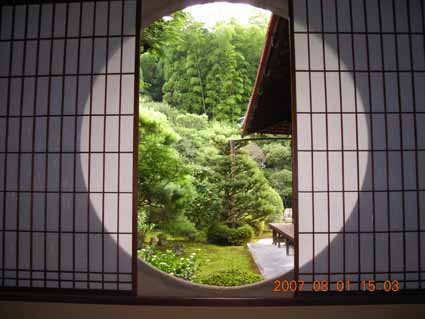 雪舟寺は皇室にゆかりの深い寺で一室には明治天皇と皇太后の御影がかざられている。ここで有名なのは雪舟禅師の作とつたえられる京都最古とされる枯山水庭でそこには雪舟作の亀石があるがこれはあまりにすばらしい出来でで夜な夜な命をえてうごきまわって住職をこまらせたらしい。この石はいまはその作者雪舟によって住職の要請で動かないようにされている。特筆されるのは部屋から丸い窓と半開きの障子越しに見える雪舟の「東庭」。これは雪舟が意図したかどうかわからないが、庭の緑と障子の白、そのまわりにひろがる黒い闇と色彩の美しさに見る人の気持ちをつかんではなさない魅力をかんじる。
