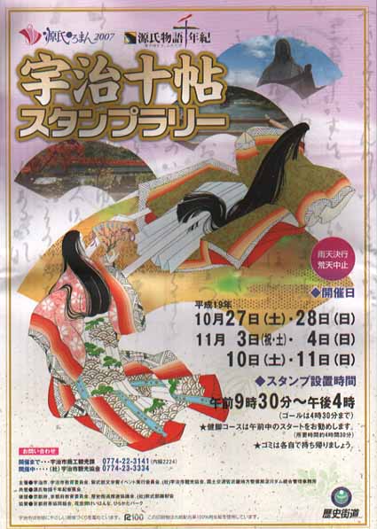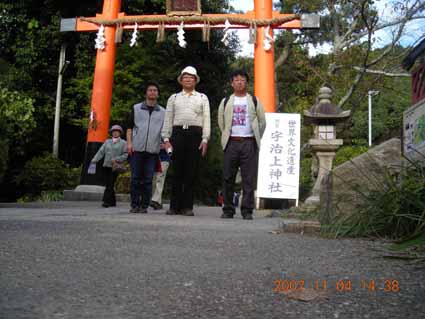 今日はかなりまえから男3人旅の予定ができており、御一緒して下さる方のためにもお天気が晴れることをいのっていたが、幸いにもこれほどはのぞむべくもないくらい心地よい秋晴れにめぐまれた。今回はかなり久しぶりに新田氏が御同行され、これでもおどろきであるのに、最初の写真のむかって右にうつっておられる寺崎氏がはじめて御同行くださった。氏は稲荷は2回目であるらしいが頂上の一の峰までははじめてでたのしみにしておられた。今日はせっかくの秋晴れのよき季節であるので、おもに歩くことを中心に考えていたが、たまたま宇治で無料スタンプラリーをやっていることを知りそれに乗っかることにした。JR宇治駅前の観光案内所にてスタンプ帳と宇治イラストマップをいただいていざ出発、コースは約1時間半をようする源氏物語の宇治十帖にゆかりの場所をあつめた基本コースとそのコースをふくめ宇治全体の名所をくわえた4時間半の健脚コースの2種類あったが、われわれはかなりおそくからの出発であったので、おせるところだけでいいという乗りではじめて結局スタンプ6個おすことができた。すこしのあいだではあったが普段接することのない源氏物語にほんのすこしでもその世界にしたしめたのはほんとうに有意義であった。イラストマップとスタンプ帳をもっておとなも子供も無邪気にポイントをさがしているすがたははたからみていてもほのぼのとしたあたたかさをかんじた。さらに世界文化遺産に登録された宇治上神社ではわれわれ3人のためにボランティアの案内ガイドの年配の男性が丁寧に解説してくださりきてよかったと感じるひとときであった。