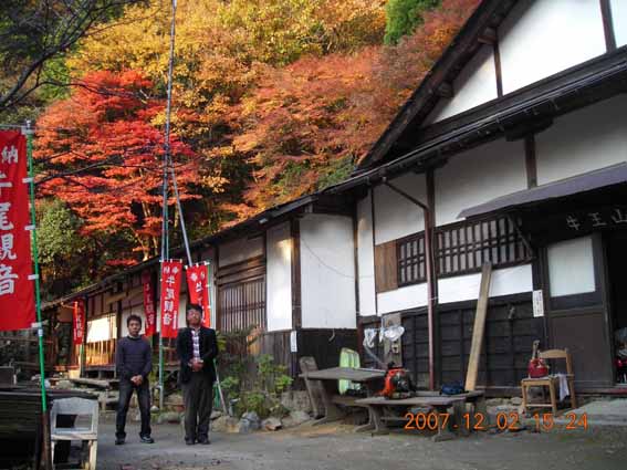 今回はいままでの伏見参りしてからの京都歩きのなかではもっとも長い距離をあるいたのではなかろうか。10時に京阪伏見駅をおり立ってから夕方5時まで食事をふくめ1時間ぐらいをのぞいて乗り物にのらずあるきっぱなし。それも平地ばかりではなく稲荷山頂上と音羽山中腹にのぼってのことである。写真はちょうど稲荷山から山科におりて食事をしたあと音羽山にむかって山科の町を横断しているところである。今日はそもそも紅葉の穴場を見に行こうということであったが私が巡拝している通称寺のうちに牛尾観音があったのでそこにいくことにきめた。いってみると最寄りのバス停から1時間かかるとかいてあったとおり、タフな道程であった。しかし音羽川沿いの道は途中 弘法大師おすわりの岩や経岩,音羽の滝,夫婦和合の滝などつぎつぎに景色があらわれ単調な思いをせずにすんだ。こういう山岳寺院には下からあるいてのぼることが到着したときのよろこびが数倍にのぼり行程そのものが参拝の一部であるととらえられる。牛尾観音では本堂の修理中の音がしていていままでの静寂と相対して不快ではないが俗世を感じ少し安心感をおぼえたのは自分でも不思議であった。お掃除中の少しこわそうなおじさんに声をかけたところその方はここの御住職であられ、今年のもみじは色がもうひとつであるとおっしゃっていた。