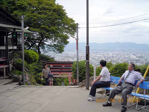 伏見稲荷本社から20分登ったところで稲荷山の尾根にでる。ここから頂上の一の峰までは尾根づたいにあるくことになる。しかし尾根づたいの参道がずーっと鳥居にみちびかれているため実際の感覚はふつうの道のようで、よくみないと両側が谷になっていることに気付かない。はじめの写真は山はだをのぼりつめたところで京都市内が一望できる。
