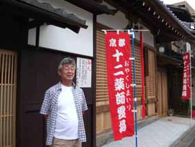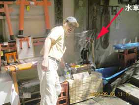 伏見稲荷は御存じの方も多いとおもいますが、神主さんが集中しているいわゆる本社というのが東山山麓に広く展開して多くの参拝客を集めているのであるが、本来の伏見稲荷は稲荷山頂上付近にあって昔の人はみんなお山に登って参拝していた。いつからかしらないがそれでは参拝が大変であるとのことでいま本社とよばれるところに拝殿をつくりここに稲荷の神をお祭りしたわけである。ときいた。その本来のお山に数ある神のなかで薬力社という薬力大神を中心にまつっている場所がある。ここは以前にも「おせきさん」という神様を紹介したことがあったが、そこで夏限定のかわいらしい水車がまわってその水で商品を冷やして販売している。写真はちょっとわかりにくいがその水車とここの御主人の木村氏。