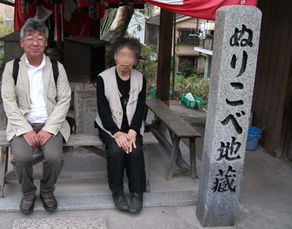 ゴールデンウィークまっただ中であるため、混雑をさけるため、同伴の井川君の意見をとりあげ稲荷より歩ける藤の森方面にむかった。なんども訪れているぬりこべ地蔵さんではそばの番小屋で線香とろうそく売りのおばあさんと参拝にこられたおばあさんがなかですわっておしゃべりをしておられた。昔ガイドブックでここの由来を読んだことがあったが、忘れてしまっていたのでここにおられるおばあさんにきいてみた。もちろんおばあさんなどと失礼なことはいわずに「奥さん」といって聞いた。さすがに「おねえさん」というには抵抗がある。ここのお地蔵さんは歯痛をぬりこめてやわらげてくださることから広義に解釈して人生の苦痛をぬりこめて取り除いてくださる、霊験あらたかなお地蔵様として広く信仰を集めていらっしゃるということであった。なにかの御縁なので一緒に写真におさまってくださった。