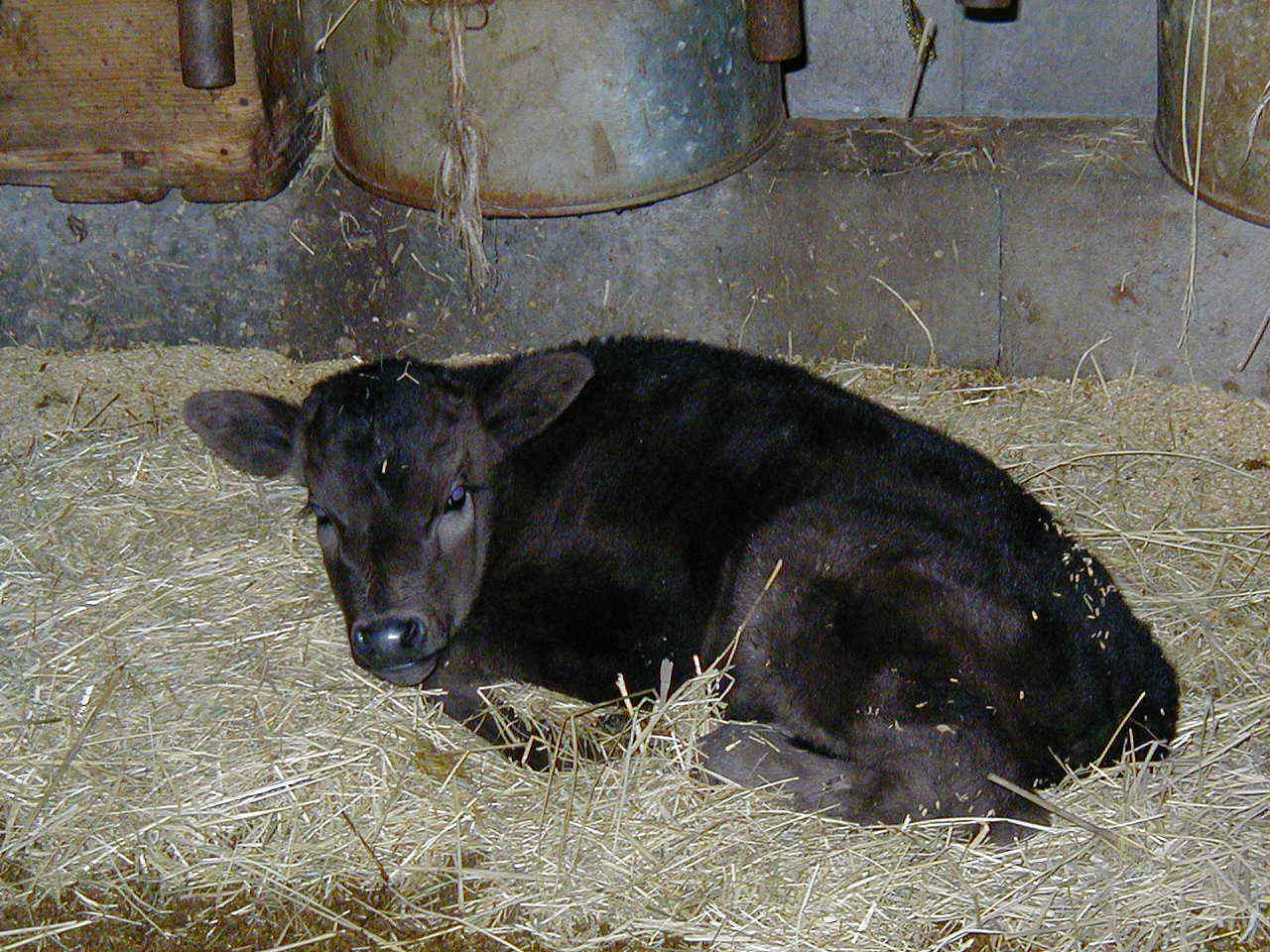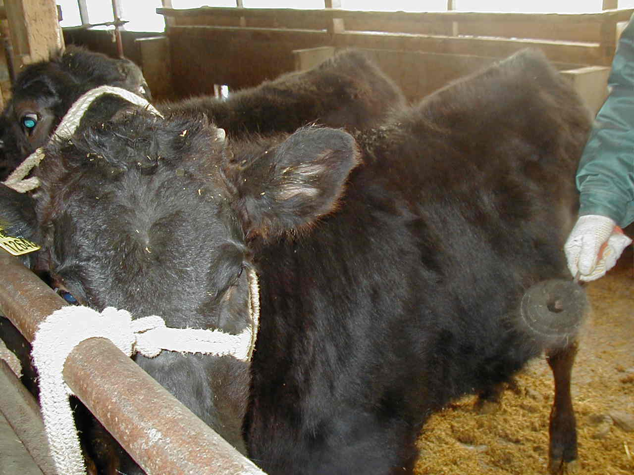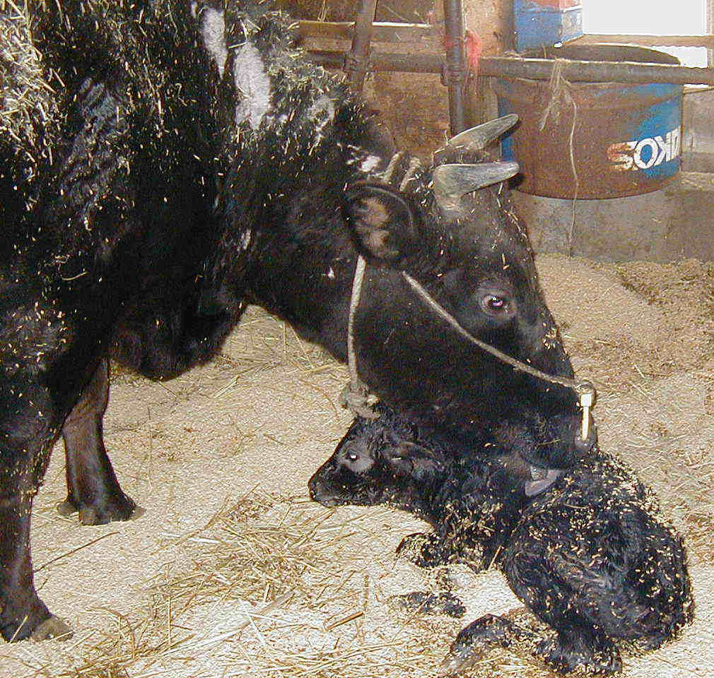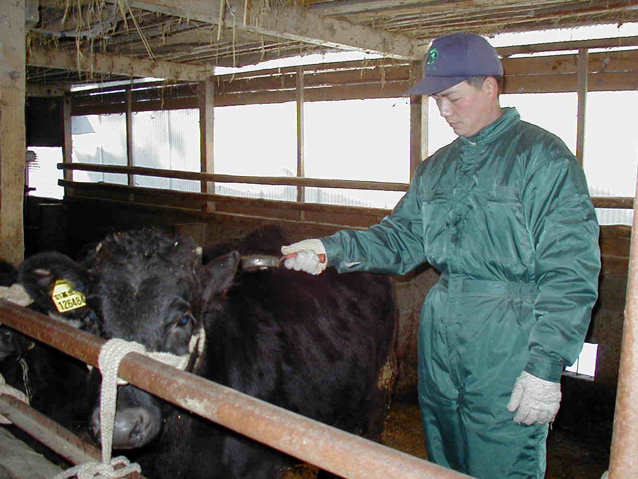 | 今の時期は、田んぼの仕事が休みなので、その分牛に手を懸けます。 毎朝、子牛達を1頭ずつブラッシングしてあげます。ブラッシングする事により胃袋が刺激され、飼料の食い込みが良くなったり、毛づや良くなったりします。 気持ち良さそうです。 |