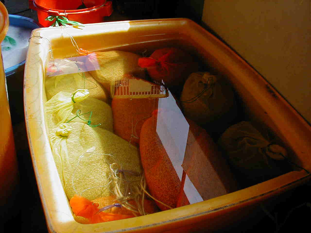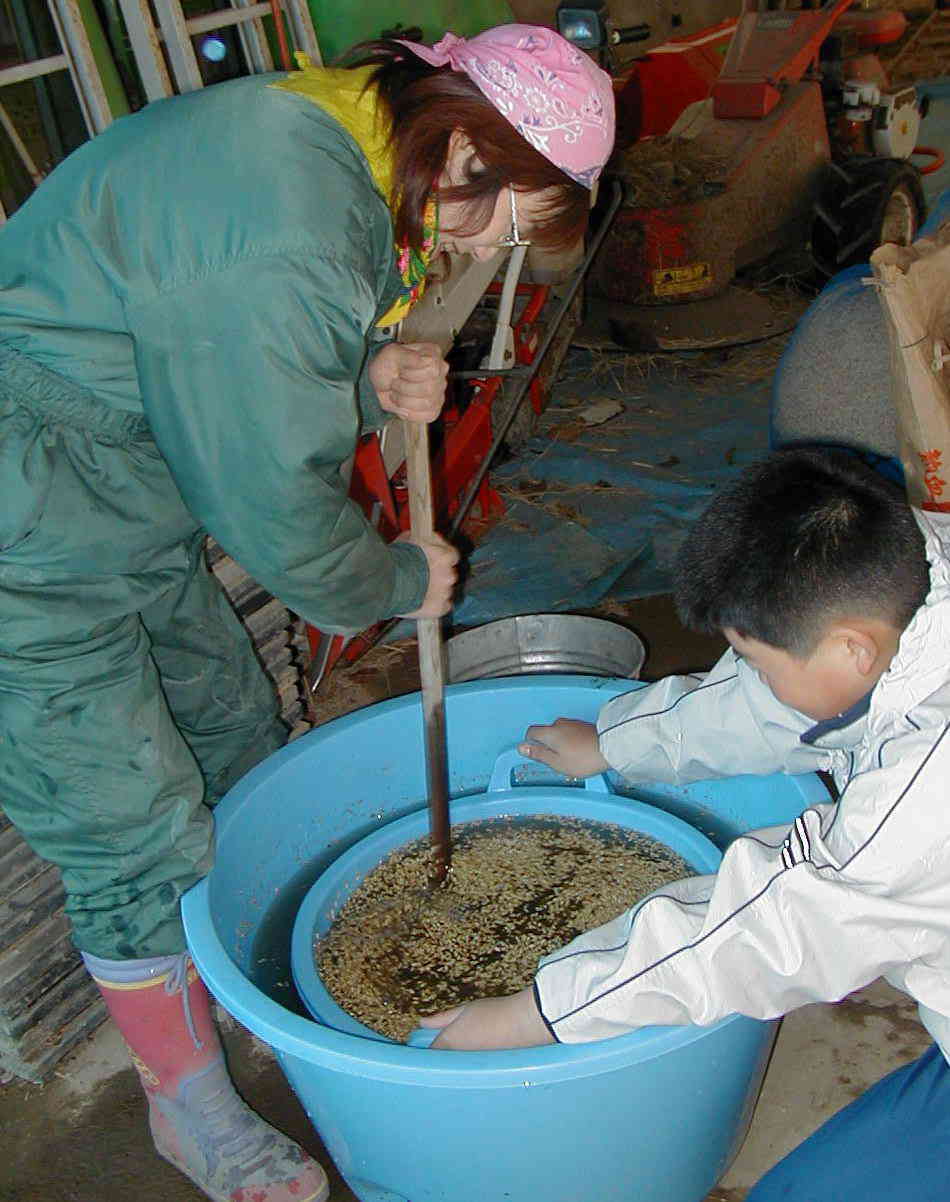 | 健康な苗を育てる為には良質の種もみを選ぶ事が重要です。発芽力の旺盛な種もみを選ぶ為に、比重選を行います。比重選とは一般に、卵が浮くぐらいの塩水を作り、もみをいれます。 そして浮いてきた比重の軽いもみを取り除き、残った比重の重いもみだけを、種もみとして、使用します。 その後、種もみを約1週間程水に浸け、そしてようやく種まきとなります。 |