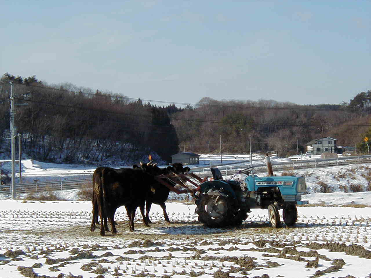 | 朝の日課になっている牛の運動です。 壊れて動かなかったトラクターを3000円で購入し、修理して使っています。 ハンドルを固定し、無人の状態で約90分運動します。普段コンクリートの上にいる牛にとって土の感触は格別の様です。 この運動によって、牛の体調が改善されます。(太り気味の家族にも最適かな?) |