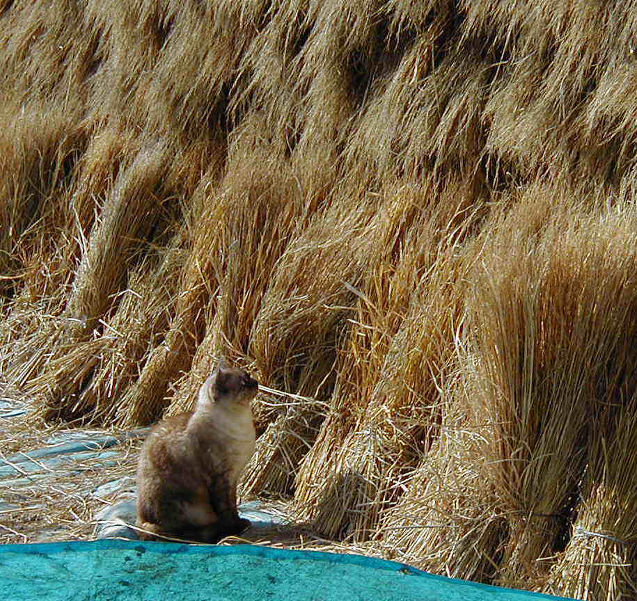 | 最近の仕事は、ビニールハウスに干しておいたワラの片付け作業をしております。 ハウスの外はマイナスでも、中は20℃ぐらいになります。またここはネコの「ぽこにゃん」のお気に入りの場所にもなっております。いつでもぽこにゃんが出入り出来る様に戸を少し開けておきます。ペットを大切にする飼主のように思われるかも知れませんが、実は入口が閉まっていると、ビニールに穴をあけてでも入ります。 我家では、人も動物も対等な存在の様です。 |
