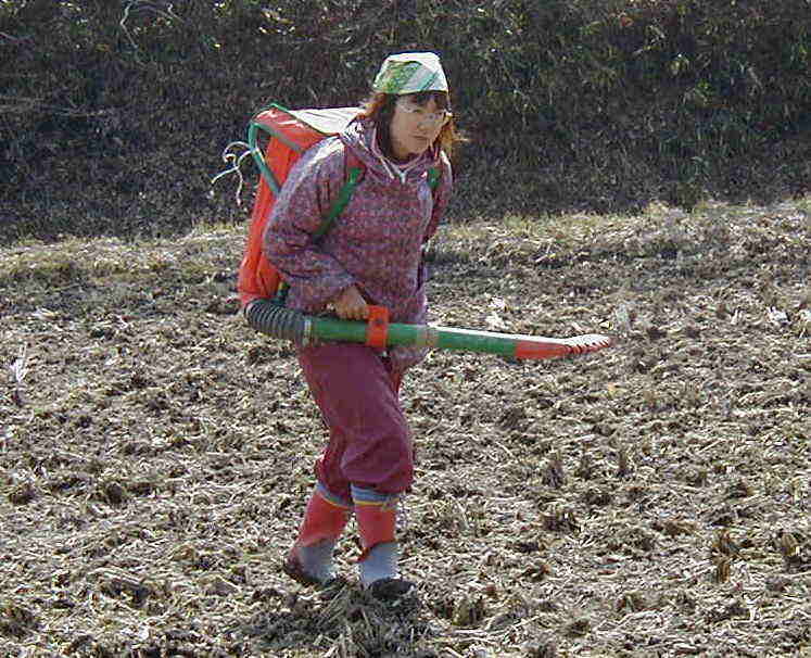 | 田んぼが小さく、トラクターでの肥料散布が困難な場所は、背中に背負って肥料を散布します。ちなみに背負っている肥料の重さは約20キロあります。最近運動不足でお悩みの方、お待ちしております。 |