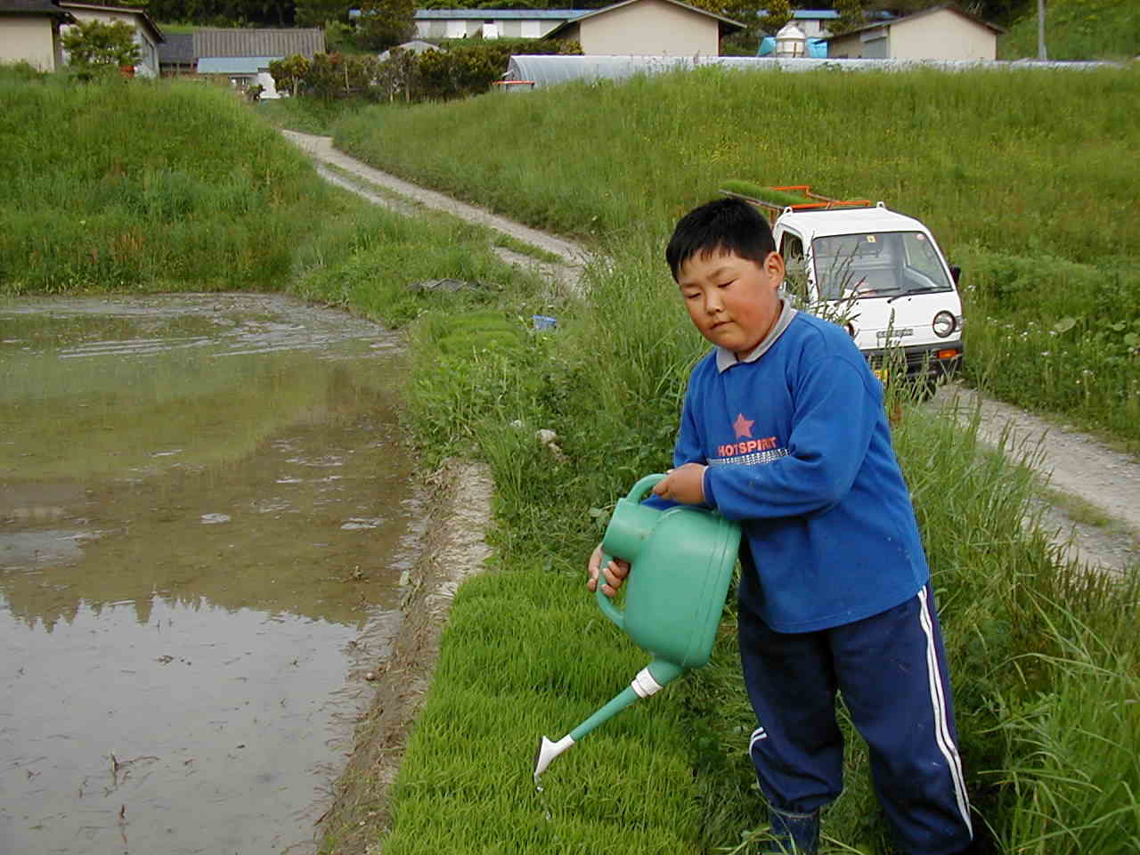 | 今日は小学校も休みなので、子供達も一緒に田植をしました。 弟には小さい田んぼ、兄には大きい田んぼを植えさせました。初めのうちは、あまり乗り気じゃない子供達でしたが、植え終わる頃には、大満足の様でした。 |