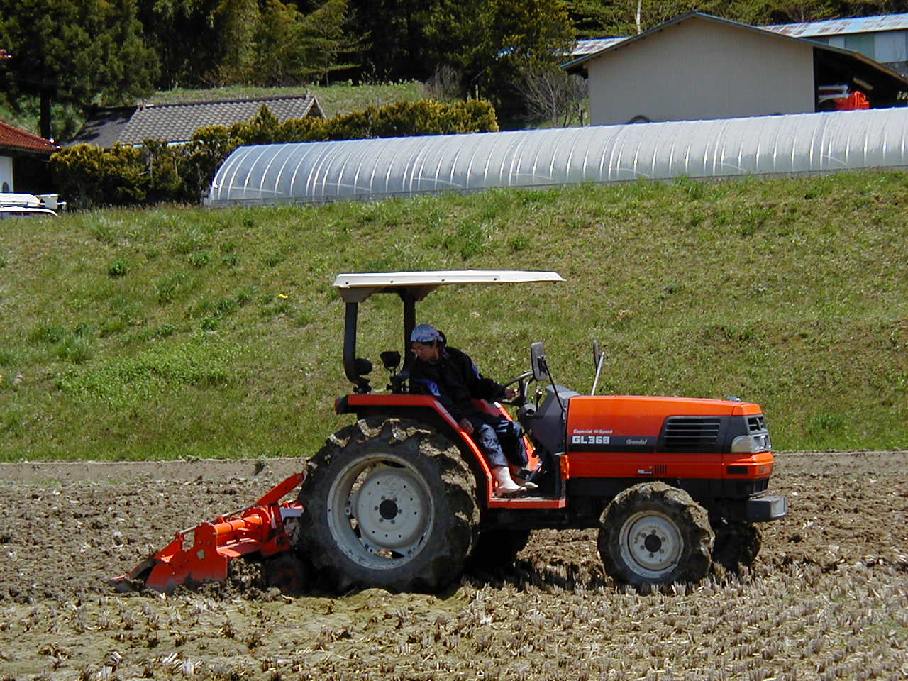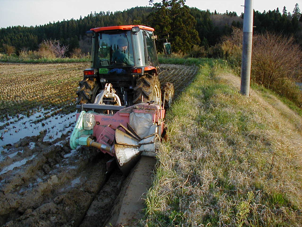 | 左の写真は、くろ塗り作業です。 田んぼの周りを、機械で固め、水漏れを防止します。 そしていよいよ耕起作業に入ります。主に自宅の田はカミさんが作業し、他所の田を自分が作業します。 |