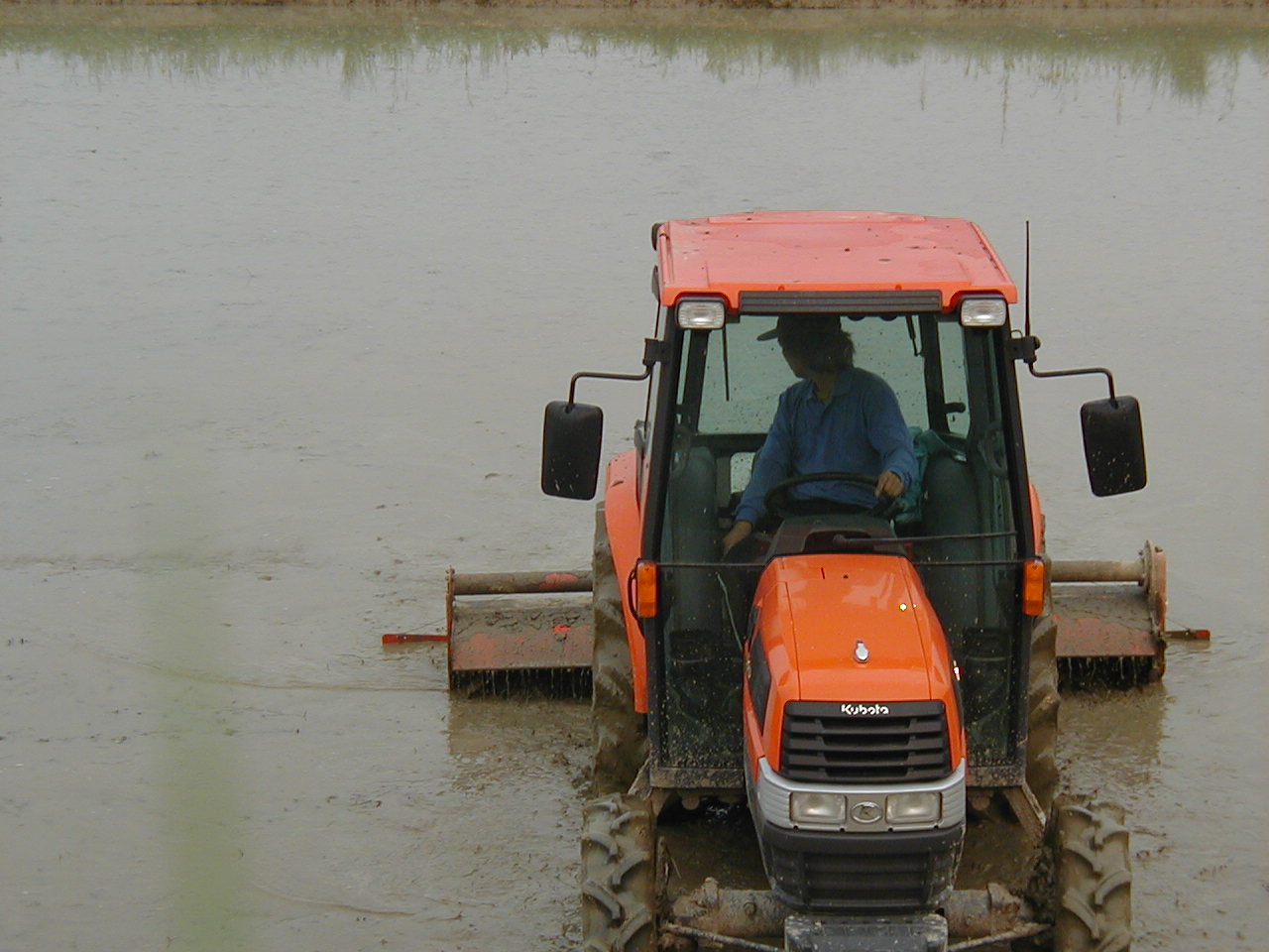 | 田んぼに水を入れ、均平にならす代かき作業開始です。この頃は朝から晩までトラクターに乗っています。トラクターの中で食事をとる事もしばしば。車内はエアコン&ステレオ付きです。 大声で歌っても、エンジンがフル回転で動いているので、外には全く聞こえません。つまりカラオケボックスにもなっているので、ストレスが溜まりません。最高です。 |