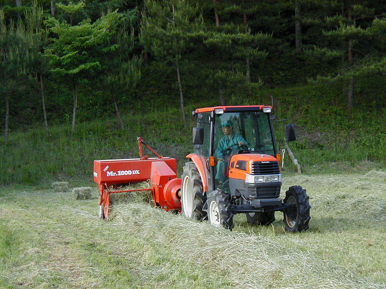 | 田んぼの仕事も一段落し、今度は牧草地の草刈に追われています。 今年は天候にも恵まれ、美味しそうな乾草(私は食べません)を集める事ができました。 牛達の喜ぶ声が聞こえてきそうです。 モゥ〜、最高! 親父ギャグですみません。 |