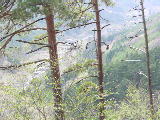 | 余里地区に入ると,右手に浅間岳が見えてきます。 | 余里地区は細長い谷に沿って川,家,山が美しく調和して絵に描けばいいような場所がたくさんあります。うぐいすが鳴いていました。 | 村ちゃんのページの情報で,余里公民館を目指しました。公民館前の停留所があり,すぐ分かりました。公民館上の鳥居と祠。 | 鳥居と祠の前の,コンクリートの道を,4,5m北へ行くと登り口があります。道の真中にひきがえるがおでむかえ。野鳥の声も色々していました。 | 公民館上の尾根を直登します。尾根は松と雑木林の境になっていて,落ち葉のたまった道というか溝のような急な場所を登ります。下に余里の谷が見えてきます。 | 登っていくと,こんな所にわらびが生えていて,おひたし1回分くらいの収穫がありました。 |