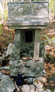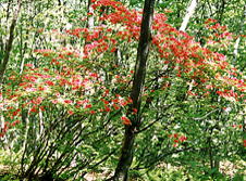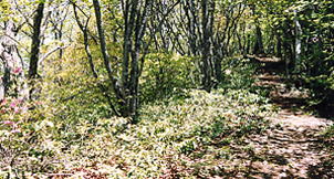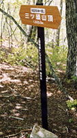 | 石の標石からすぐ南の道端に青木の奈良本地区の方を向いて小さな石祠がありました。お賽銭と缶コーヒーがおいてありました。歩く人が増えてきたのでしょう。 | そのすぐ南に三ツ頭山頂の標識がありました。木の間ごしに間近に次の1568m峰が見えました。また,東側の滝川の方の山腹の広がりも感じられました。このあたりから,山頂部の尾根道一帯は,ダケカンバやみずならの林にツツジが彩りをそえた別世界といった感じでとてもいい場所になりました。休憩して何か飲んだり食べたりしましたが,全く人気も無く,県内,熊の出没のニュースもあり,昨年の上田さんの茂来山の熊の話など思い出し,いまいち落着きません。これ以上進む勇気が無く当初の予定どおり引き返す事にしました。(帰りに石の標石まで戻ると,やや下の方で,ガサガサと動物の逃げる?音がしました。熊より小さいような音でしたが。) | 以前来た時は,芽吹いたばかりで,茶色っぽい印象の記憶が残っていましたが,新緑の今がこのコースの旬かな,と思いました。(ちょっと遅いか?)落葉樹の新緑とミツバツツジと山つつじとその中間の濃い桃色のツツジ(名前が分からない)の三種類が彩りをそえ,また尾根すじに所々古い松,針葉樹など,あり,何ともいえないいい林でした。このままどんどん尾根道を南に進みたい気分でしたが,前記の理由で止めておきました。家に帰って,御鷹山縦走の文を読み直してみると,次の1568m峰が石祠も三つある,一番の峰であった事に気づき,ああそこまで行けばよかった,そこも三ツ頭なのか違った名なのか分かったのに,と思いました。私の今の記憶では,その峰はずっと向こうのような気がしていました。 |