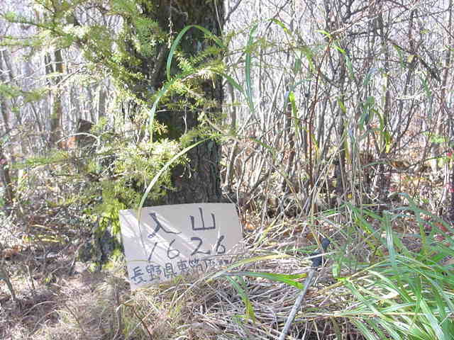 山頂の木に,「入山1626長野県東筑摩郡四賀村」とダンボールに書いたものが置いてありました。2003,10,18