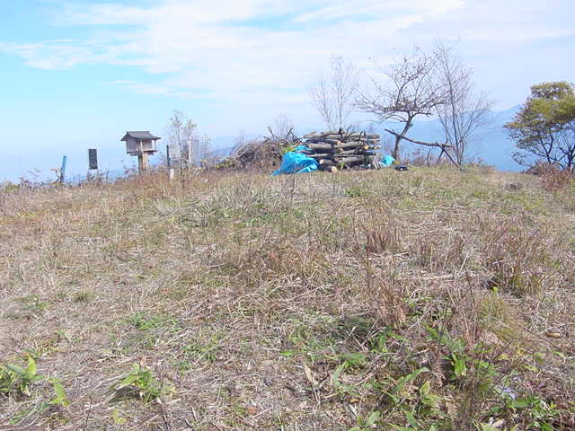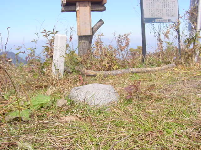 | 頂上には,室賀の地区の正月登山の記念プレートや,地元川西小学校の五年生の登山記念の杭があったりと,地元の人により新しい登山道が作られ,かってのように親しまれた山に戻り出している感じがありました。展望もよく,山頂も広々とした草原で大勢の登山にもよさそうです。ただ登山口までの林道が車高の高い車でないと腹を擦ります。林道を歩けばいいのですが。(2003,10,25) |