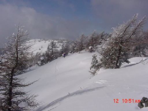 | 三方ケ峰へは、さらに尾根を進まないといけないが、シールをはずしてここから引き返す。 締まった雪に粉雪が多少積もった状態で、滑りやすく気持ちが良い。池の平周辺は色々自由にコースがとれると思う。 リフト終点まですぐ着いてしまう湯の丸スキー場からの手ごろな小ツアーです。(2005、2,12) |