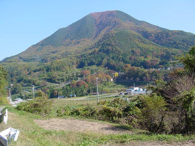 西側(青木村側から見た夫神岳)山すそに沓掛温泉が見える。