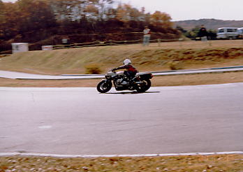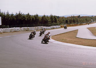 せ 集合写真を撮り午後の第3ヒ−トが始 まる。ここで心配なのがガソリンだ。なんと 家を出て高速を走りそのままサ−キット入 りして走っていたのだ。他の連中は昼休み に給油している。タンクを覗くとまだあるが 心配だ。こんな心配と気温の低下、コケた ら帰れない心配と 前が思うように空かな いのとでタイムが伸びない。第3ヒ−トが終 ってタンクを覗くとまだガソリンはある。第4 ヒ−トはガンガン行ってみよう。苦手だった 左コ−ナ−もガンガン攻めて2速全開.9 000rpm超で走りシケイン前の突っ込み |