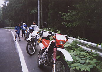 度 林道に突入。ダ−トを滑りながらも楽しんで走る。途中で昼食。カップラ-メンやおに