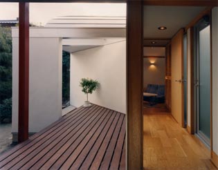 手前に、内と外をつなぐ中間領域的なデッキ空間をしつらえ、それに廊下を沿わせて