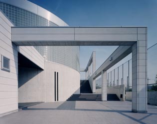 間構造を持っている。そしてこの基本グリッドと、挿入された曲面壁は、グランドとこの建物の間に