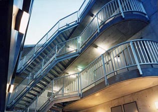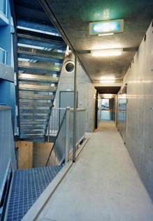ている。斜めの屋外階段を含む吹抜けの中庭空間は、少し囲い込まれ
