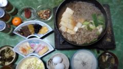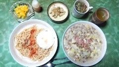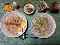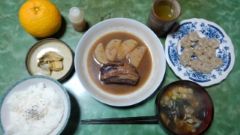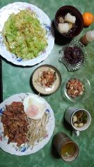 今日の夕食は焼肉、卵、モヤシ、塩焼きそば、お新香、スープ、日本茶、ミカン、お汁粉、餡子、ナッツ、乳酸菌飲料。焼肉は豚のシロの味噌だれ焼きとモヤシ炒めと目玉焼き。塩焼きそばは塩味でキャベツを入れて焼いたもので、フライドオニオンを添えて。お新香は白菜。スープはネギとワカメと切り干し大根と煮干し。デザートはお汁粉(餅、栗、餡子)、餡子(栗のせ)、ナッツ、乳酸菌飲料。