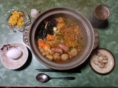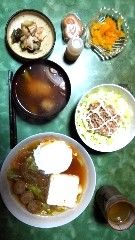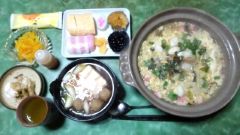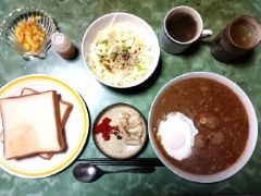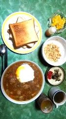 今日のランチは食べ放題(^0^)夕食はお雑煮、チャンプル、おから納豆、お新香、日本茶、マーマレード、乳酸菌飲料。お雑煮は焼きもちとネギと肉団子の醤油味。チャンプルは豆腐とウインナーと卵と人参とキャベツとモヤシとニンニクの塩味。オカラ納豆はネギを散らして。お新香は白菜。デザートはマーマレードと乳酸菌飲料。朝は2時間程朝寝坊。天気が良いので布団を干す。その後は自転車で駐車場の方に。帰りは餌の買い出し。家に帰ってからは電車で乗換駅まで行き食べ放題(^0^)カレーライス×1,牛筋の釜めし×4,コンポタージュ、オニオンスープ、ミルクココア、〆はコーヒー。満腹です(^0^)最寄りの駅で降りてからは図書館で情報の収集。今日はノンビリと体を休めました。