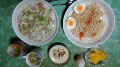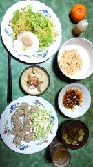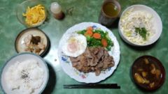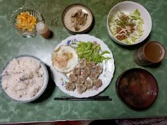 夕食は焼肉、野菜炒め、卵、サラダ、お新香、味噌汁、ご飯、日本茶、柚の生ジャム、乳酸菌飲料。焼肉は豚の塩タレ焼きで、野菜炒め(キャベツ、ニンジン)と目玉焼きを添えて。サラダは大根とキャベツとフライドオニオンとネギとニンニクをマヨネーズで。お新香は白菜。味噌汁はネギとワカメと煮干し。デザートは柚の生ジャムと乳酸菌飲料。