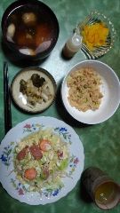 今日の夕食はペペロンチーノ、卵、ウインナーとレンズのシチュー、お新香、スープ、日本茶、ジャム、乳酸菌飲料。ペペロンチーノは鷹の爪とニンニクをオリーブオイルはで軽く炒め、茹であげたスパゲッティーを和える様に炒めたもので、目玉焼きを添えて。ウインナーとレンズ豆のシチューはジャガイモと玉ねぎとキャベツを入れて。お新香は白菜。スープはワカメとネギと煮干と切り干し大根。デザートは柚の生ジャムと乳酸菌飲料。会社の帰りに電車が止まっていた。仕方ないので乗換駅迄歩くことに。同じ様な事を考える人達は居るもので、暗い夜道は賑やか。駅に着いてからネットで調べると・・・若気のいたりの様でした。朝じゃなくて良かった。