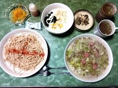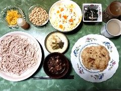 今日の夕食は盛り蕎麦、ジャンボかき揚げ、サラダ、酢の物、お新香、日本茶、そば湯、大豆、ジャム、乳酸菌飲料。盛り蕎麦は汁に付け、薬味はネギ。ジャンボかき揚げは小エビと玉ネギで、汁に付けて。サラダは卵とキャベツと大根をマヨネーズで。酢の物はワカメと煮干し。お新香は白菜。日本茶は大豆を入れて福茶に。デザートは大豆と柚子の生ジャムと乳酸菌飲料。昼休みに弁当を食いながらTVを見ていると、最近は節分で豆まきをしない家庭も増えてきているとか?恵方巻とかに押されているのかしら?今日は豆まきの後はたっぷりと豆を食べましょうか(≧∇≦)b