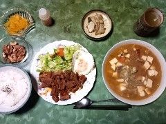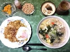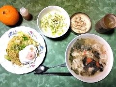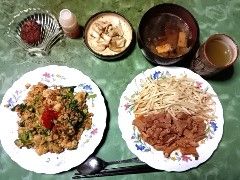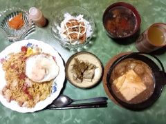 今日の夕食は焼肉、モヤシ炒め、炒飯、お新香、味噌汁、日本茶、干し柿、乳酸菌飲料。焼肉は豚のシロの甘味噌炒めで、モヤシ炒めを添えて。炒飯は卵と人参とキャベツを醤油味で炒めたもので、福神漬けを添えて。お新香は白菜。味噌汁は大根とワカメと煮干しとキクラゲとヒジキとアゲの具沢山。デザートは干し柿と乳酸菌飲料。