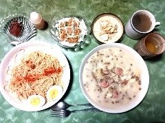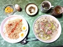 今日の夕食はペペロンチーノ、卵、ウインナーとレンズ豆のシチュー、お新香。スープ、日本茶、マンゴー、乳酸菌飲料。ペペロンチーノはニンニクと鷹の爪をオリーブオイルで軽く炒め、茹であげたスパゲッティを和えるように炒めたもので、ゆで卵を添えて。ウインナーとレンズ豆シチューは、ジャガイモとキャベツと大根を入れて。お新香は白菜。スープはワカメとネギと煮干し。デザートはドライマンゴーと乳酸菌飲料。昼休みに弁当を食いながらTVを見ていると、国民審議会?に参加した野党はミライ?だけだとか?マンモス与党だから国会なんて形式上の茶番劇ができるもの(^_^;)ただ、昔と違ってSNSとかが情報収集を大きく左右しているからね!選挙に勝ったのもSNS、一歩間違えればSNSでダメージも大きいかもね。時代の変化か(´`:)