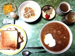 今日の夕食はスープカレー、卵、納豆サラダ、お新香、スープ、トースト、日本茶、干し柿、乳酸菌飲料。スープカレーは肉団子とレンズ豆と人参と玉ネギとジャガイモと大根とキャベツとキクラゲとニンニクの辛口で、目玉焼きを添えて。納豆サラダはキャベツと大根とフライドオニオンとネギを入れてマヨネーズで。お新香は白菜と福神漬け。スープはワカメと煮干しとネギ。トーストはキツネ色に。デザートは干し柿と乳酸菌飲料。昼休みに弁当を食いながらTVを見ていると、国会が開催されるにあたり、消費税減額の財源を如何するの??と、心配されていた。年金とか福祉の財源も就職氷河期世代の債務問題も有るし・・・そう、年金って自分達が