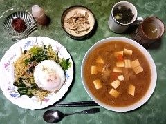 今日のランチは食べ放題。夕食はモツ煮、塩焼きそば、卵、お新香、スープ、日本茶、干し柿、乳酸菌飲料。モツ煮は豚のシロと豆腐と大根と人参とキクラゲとニンニクを味噌仕立てで煮込んだもの。塩焼きそばは塩味でキャベツとモヤシを入れて塩コショウで炒め、フライドオニオンを添えて。お新香は白菜。スープはワカメとネギと煮干し。デザートは干し柿と乳酸菌飲料。朝は2時間程朝寝坊。布団を干してからのんびりとTVを見ながら朝食。その後は、研修の為、着替えて電車で会場迄。裏覚えで行ったら道に迷う。地図をきちんと見て何とかたどり着いた。お久しぶりなので記憶違いです。編集は1時間半程で終わり、お昼は乗換駅で下車して食べ放題。カレーライス×5,コンポタージュ、オニオンスープ、コカ・コーラ、〆はコーヒー。満腹です(^0^)家に帰ってからは自転車で駐車場の方に。帰りは餌の買い出し。1時間半の研修の為に1日がつぶれてしまった感じの休日でした。トホホホホ。